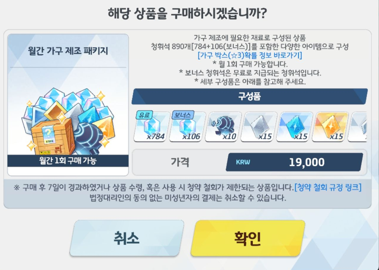 첫 번째는 19,000원의 월간 가구 제조 패키지. 청휘석 784개 + 106개를 받아 갈 수 있고, 기동석과 더불어 합성석을 받아 갈 수 있다. 3성 카페 가구도 포함되어 있지만 그것보다는 앞에 언급한 아이템이 더 좋아서 가져가기에 안성맞춤이다. 특히 초반에는 필요한 아이템을 많이 제작해야 하기 때문에, 빠른 성장을 원한다면 무조건이다.