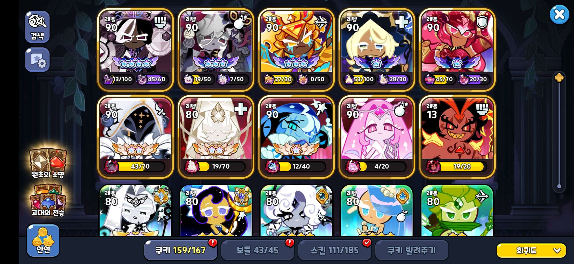 - 90레벨 달성에 별사탕 소모가 크기 때문에, 범용성 높은 주력 전설 쿠키 위주로 선택적 강화를 진행하는 것이 중요.