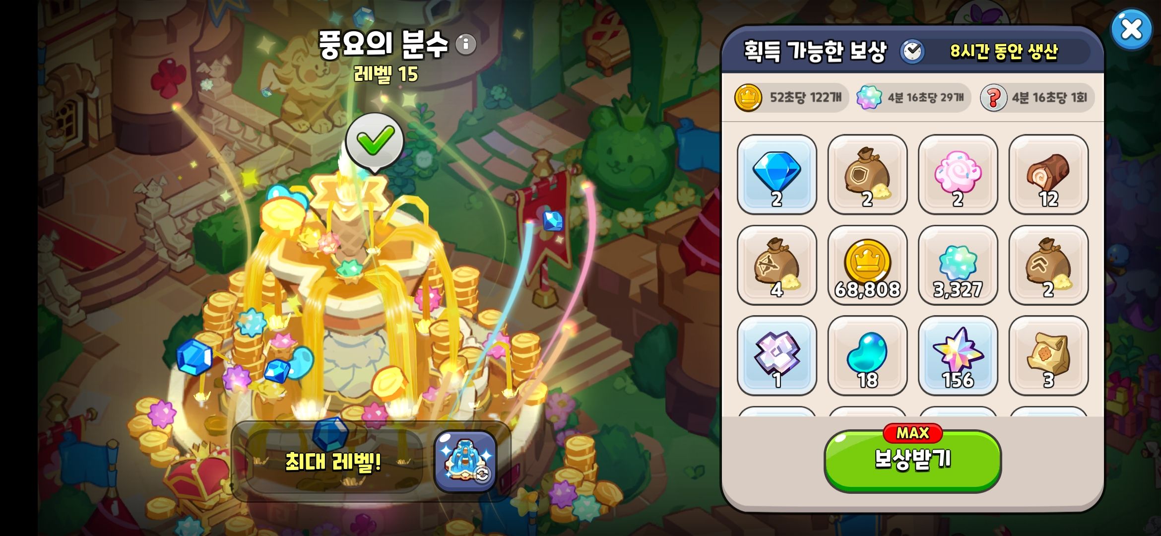 우선 강화에 필요한 재료부터 알아보자. 첫 번째는 레벨을 올릴 수 있는 별사탕이 있다. 구할 수 있는 곳은 다양해서 획득하기는 어렵지 않다. 하나씩 살펴보자면 왕국 내에 있는 하우스를 지어 시간별로 획득할 수 있다. 건물 레벨에 따라서 얻을 수 있는 재화의 개수가 증가한다.